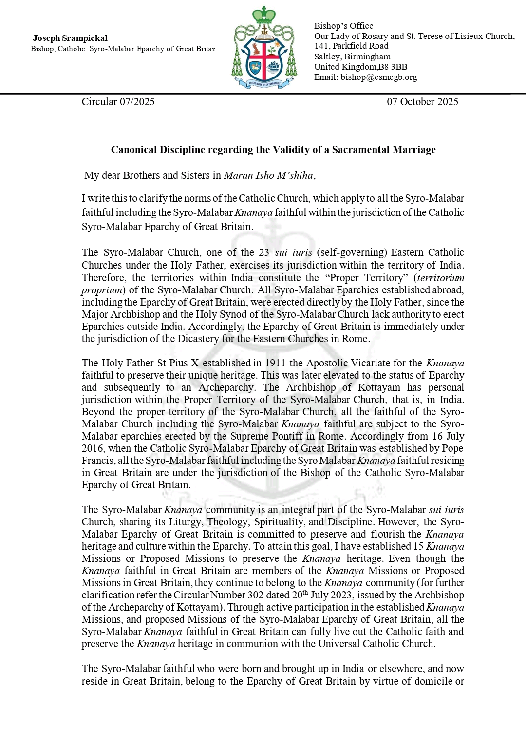 യുകെയിലെ ക്നാനായ കത്തോലിക്കാ വിശ്വാസികളുടെ തനിമയും പാരമ്പര്യവും സംരക്ഷിക്കാൻ സർക്കുലറുമായി ഗ്രേറ്റ് ബ്രിട്ടൻ സീറോമലബാർ രൂപത