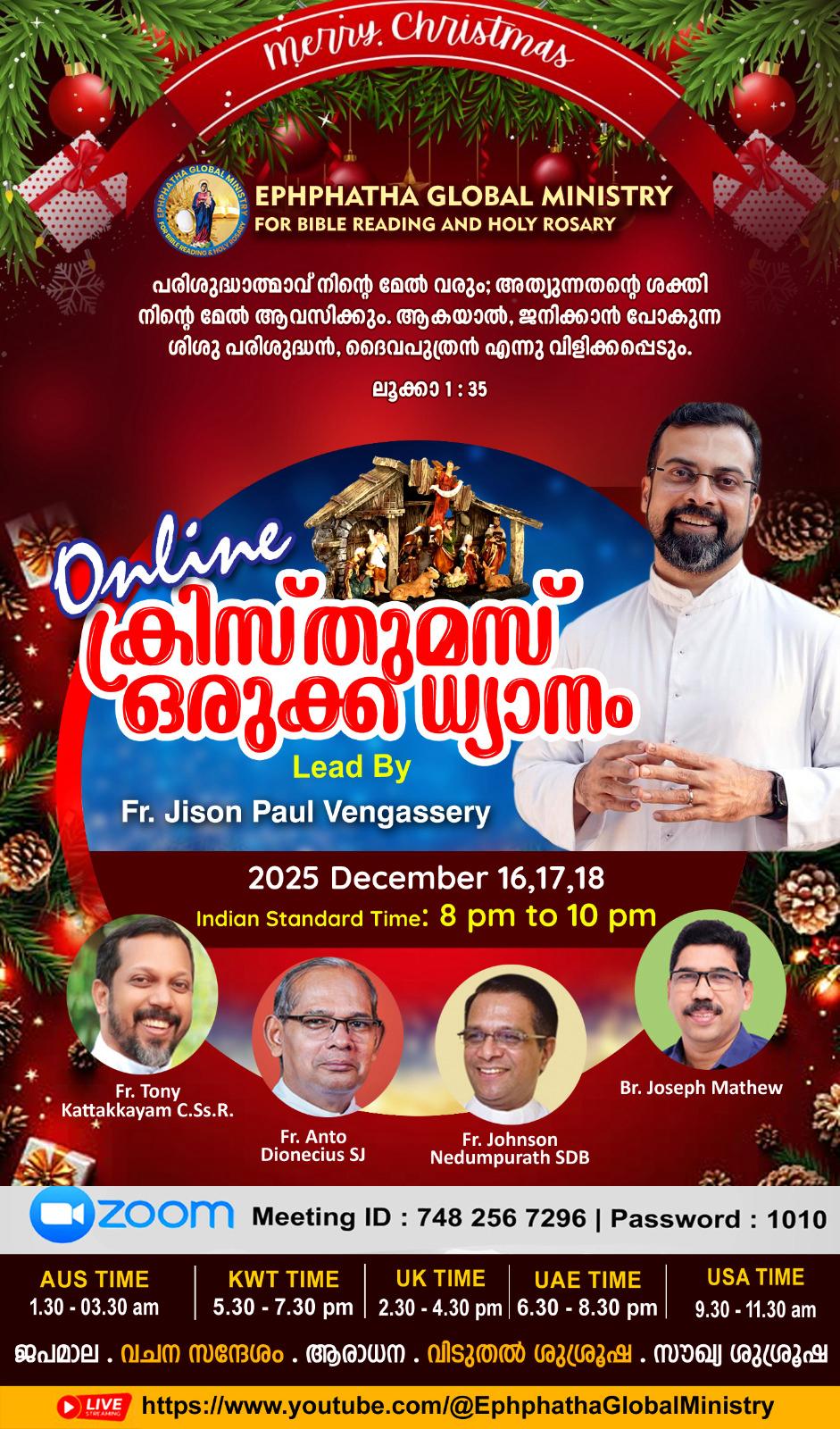 ഇന്ത്യൻ സമയം രാത്രി 8 മുതൽ 10 മണിവരെയാണ് ധ്യാനം. ജപമാല, വചന സന്ദേശം, സൗഖ്യ-വിടുതൽ ശുശ്രൂഷ എന്നിവ ഉൾപെടുത്തിരിക്കുന്ന ധ്യാനത്തിലേക്ക് ക്രിസ്തുമസ് ഒരു പുതിയ അനുഭവമാകുവാൻ ഏവരെയും ക്ഷണിക്കുന്നതായും എഫ്ഫാത്ത ഗ്ലോബൽ മിനിസ്ട്രി അറിയിച്ചു.