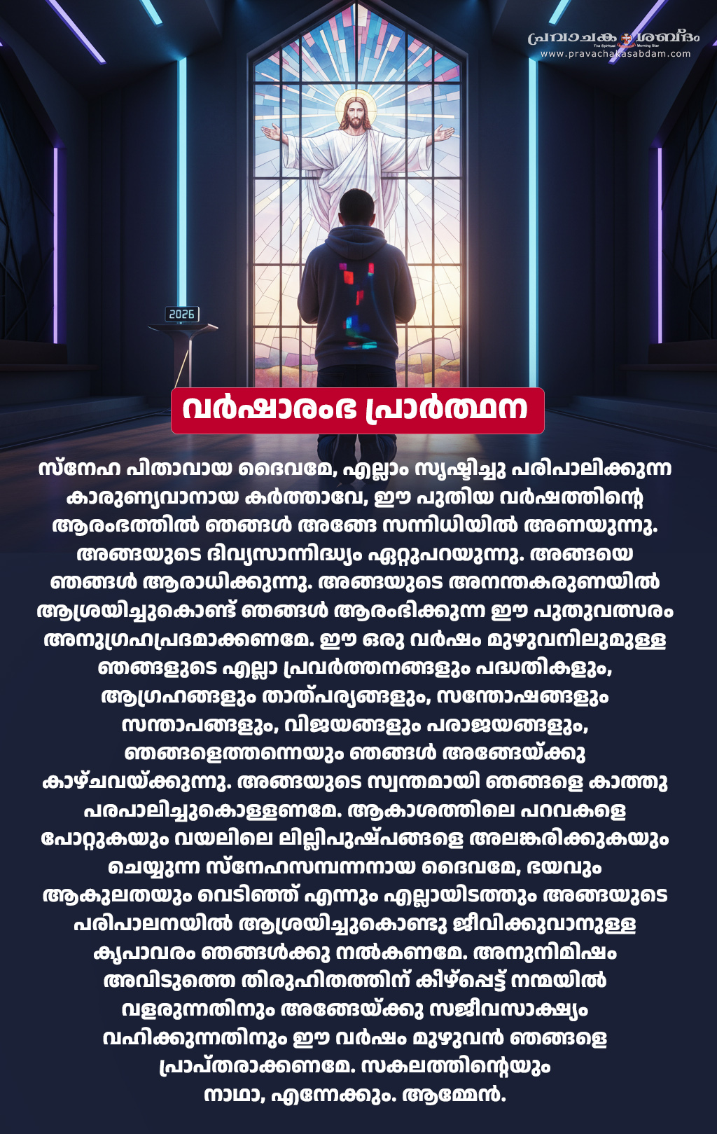 സ്നേഹ പിതാവായ ദൈവമേ, എല്ലാം സൃഷ്ടിച്ചു പരിപാലിക്കുന്ന കാരുണ്യവാനായ കർത്താവേ, ഈ പുതിയ വർഷത്തിന്റെ ആരംഭത്തിൽ ഞങ്ങൾ അങ്ങേ സന്നിധിയിൽ അണയുന്നു. അങ്ങയുടെ ദിവ്യസാന്നിദ്ധ്യം ഏറ്റുപറയുന്നു. അങ്ങയെ ഞങ്ങൾ ആരാധിക്കുന്നു. അങ്ങയുടെ അനന്തകരുണയിൽ ആശ്രയിച്ചുകൊണ്ട് ഞങ്ങൾ ആരംഭിക്കുന്ന ഈ പുതുവത്സരം അനുഗ്രഹപ്രദമാക്കണമേ. ഈ ഒരു വർഷം മുഴുവനിലുമുള്ള ഞങ്ങളുടെ എല്ലാ പ്രവർത്തനങ്ങളും പദ്ധതികളും, ആഗ്രഹങ്ങളും താത്പര്യങ്ങളും, സന്തോഷങ്ങളും സന്താപങ്ങളും, വിജയങ്ങളും പരാജയങ്ങളും, ഞങ്ങളെത്തന്നെയും ഞങ്ങൾ അങ്ങേയ്ക്കു കാഴ്ചവയ്ക്കുന്നു.
