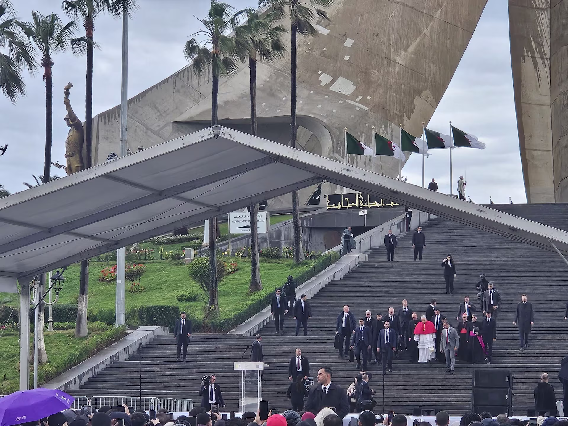 ഫ്രഞ്ച് കൊളോണിയലിസത്തിനെതിരായ അൾജീരിയൻ സ്വാതന്ത്ര്യ സമരത്തിൽ വീരമൃത്യു വരിച്ച രക്തസാക്ഷികളുടെ സ്മരണാർത്ഥം നിർമ്മിച്ചിരിക്കുന്ന സ്ഥലത്തെത്തിയ പാപ്പയെ സ്മാരകത്തിന്റെ പടവുകൾക്ക് താഴെ മന്ത്രിസഭയിലെ ഒരു അംഗം സ്വീകരിച്ചു. തുടർന്ന്, സൈനിക ഉദ്യോഗസ്ഥൻ പാപ്പയെ, പുഷ്പചക്രവുമായി പടവുകൾക്ക് മുകളിലേക്ക് അനുഗമിച്ചു. സ്മാരകത്തിന് മുന്നിൽ പുഷ്പചക്രം അർപ്പിച്ച ശേഷം ദേശീയഗാനം ആലപിക്കുകയും രക്തസാക്ഷികളെ ആദരിക്കാനായി ഒരു നിമിഷം മൗനം ആചരിക്കുകയും ചെയ്തു. സ്മാരകത്തിന്റെ മറുഭാഗത്ത് ഒത്തുകൂടിയിരിക്കുന്ന ഏകദേശം അയ്യായിരത്തോളം വരുന്ന ജനങ്ങളെ പാപ്പ തുടർന്ന് അഭിവാദ്യം ചെയ്തു. അൾജീരിയയിലെ ആർച്ച് ബിഷപ്പ് കർദ്ദിനാൾ ജീൻ പോൾ വെസ്കോ, പാപ്പായെ ഔദ്യോഗികമായി സ്വാഗതം ചെയ്തു സംസാരിച്ചു.