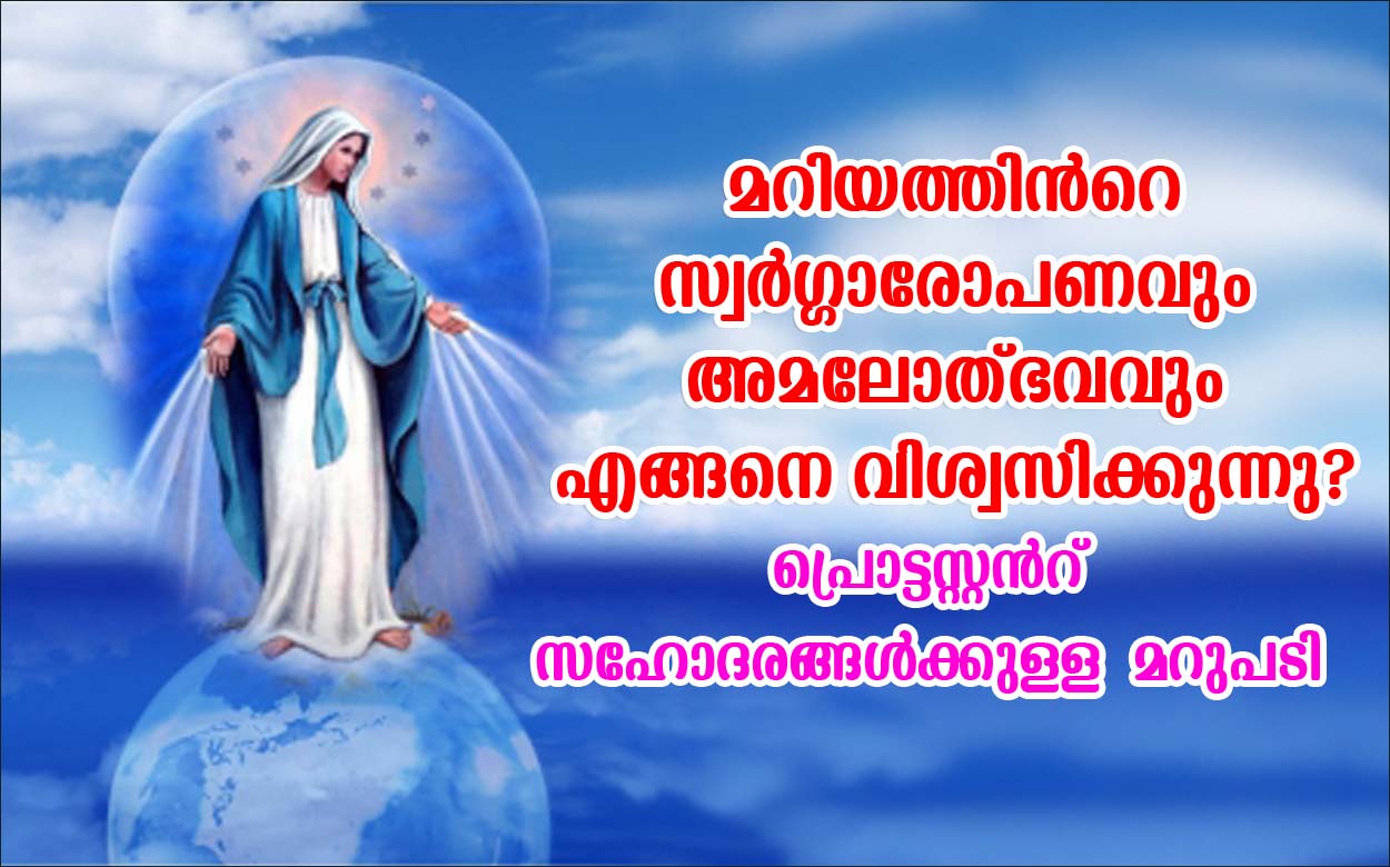 | Content | കത്തോലിക്കാസഭ പഠിപ്പിക്കുന്ന രണ്ടു വിശ്വാസ സത്യങ്ങളാണ് പരിശുദ്ധ കന്യകാ മറിയത്തിന്റെ 'അമലോത്ഭവവും സ്വര്ഗ്ഗാരോപണവും'. "അനന്യമായ ദൈവകൃപയാലും സര്വശക്തനായ ദൈവത്തിന്റെ ആനുകൂല്യത്താലും മനുഷ്യവംശത്തിന്റെ രക്ഷകനായ യേശു ക്രിസ്തുവിന്റെ യോഗ്യതകളെ മുന്നിറുത്തിയും ഏറ്റവും പരിശുദ്ധയായ കന്യകാമറിയം അവളുടെ ഉത്ഭവത്തിന്റെ ആദ്യ നിമിഷം മുതല് ഉത്ഭവ പാപത്തിന്റെ സകല മാലിന്യങ്ങളില് നിന്നും പരിരക്ഷിക്കപ്പെട്ടു" എന്ന് പീയൂസ് ഒമ്പതാമന് മാര്പാപ്പ 1854-ല് 'അമലോത്ഭവം' എന്ന വിശ്വാസ സത്യത്തിലൂടെ പ്രഖ്യാപിച്ചു. (Pious IX, Ineffabilis Deus).