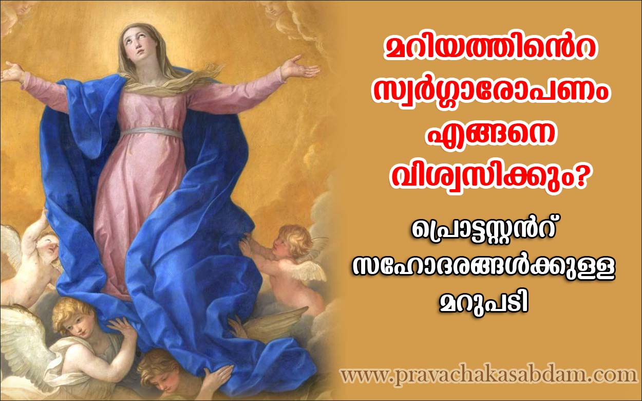മറിയത്തിന്റെ സ്വര്ഗ്ഗാരോപണത്തെക്കുറിച്ച് സംശയിക്കുന്നവര് ആദ്യം വെളിപാടിന്റെ പുസ്തകം 12-ാം അധ്യായം വായിക്കുന്നത് നന്നായിരിക്കും. കൃപ ലഭിച്ചവര്ക്ക്, ഇവിടെ പ്രസ്താവിച്ചിരിക്കുന്ന "സ്ത്രീ" പരിശുദ്ധ കന്യകാ മറിയം തന്നെയാണെന്ന് മനസ്സിലാക്കാന് ബുദ്ധിമുട്ടുണ്ടാവില്ല. എന്നാല് പിന്നെയും ഒരു ചോദ്യം ഉയര്ന്നു വരാം. മറിയം ശരീരത്തോടെ സ്വര്ഗ്ഗത്തിലാണെന്ന് എങ്ങനെ വിശ്വസിക്കും?