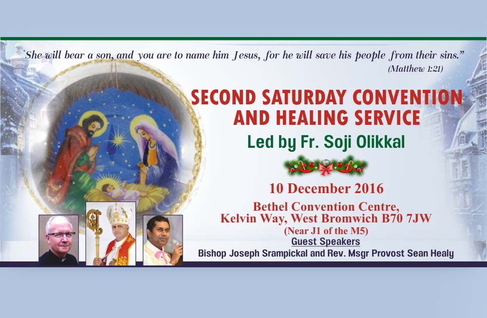 ഉണ്ണിയേശുവിനെ ഹൃദയത്തിൽ സ്വീകരിക്കുവാൻ ഒരുങ്ങുന്ന ഡിസംബർ മാസ രണ്ടാം ശനിയാഴ്ച കൺവെൻഷനിലേക്ക് ഫാ.സോജി ഓലിക്കലും സെഹിയോൻ ടീമും യേശുനാമത്തിൽ ഏവരേയും ബർമിംങ്ഹാം ബഥേൽ സെന്ററിലേക്ക് ക്ഷണിക്കുന്നു.