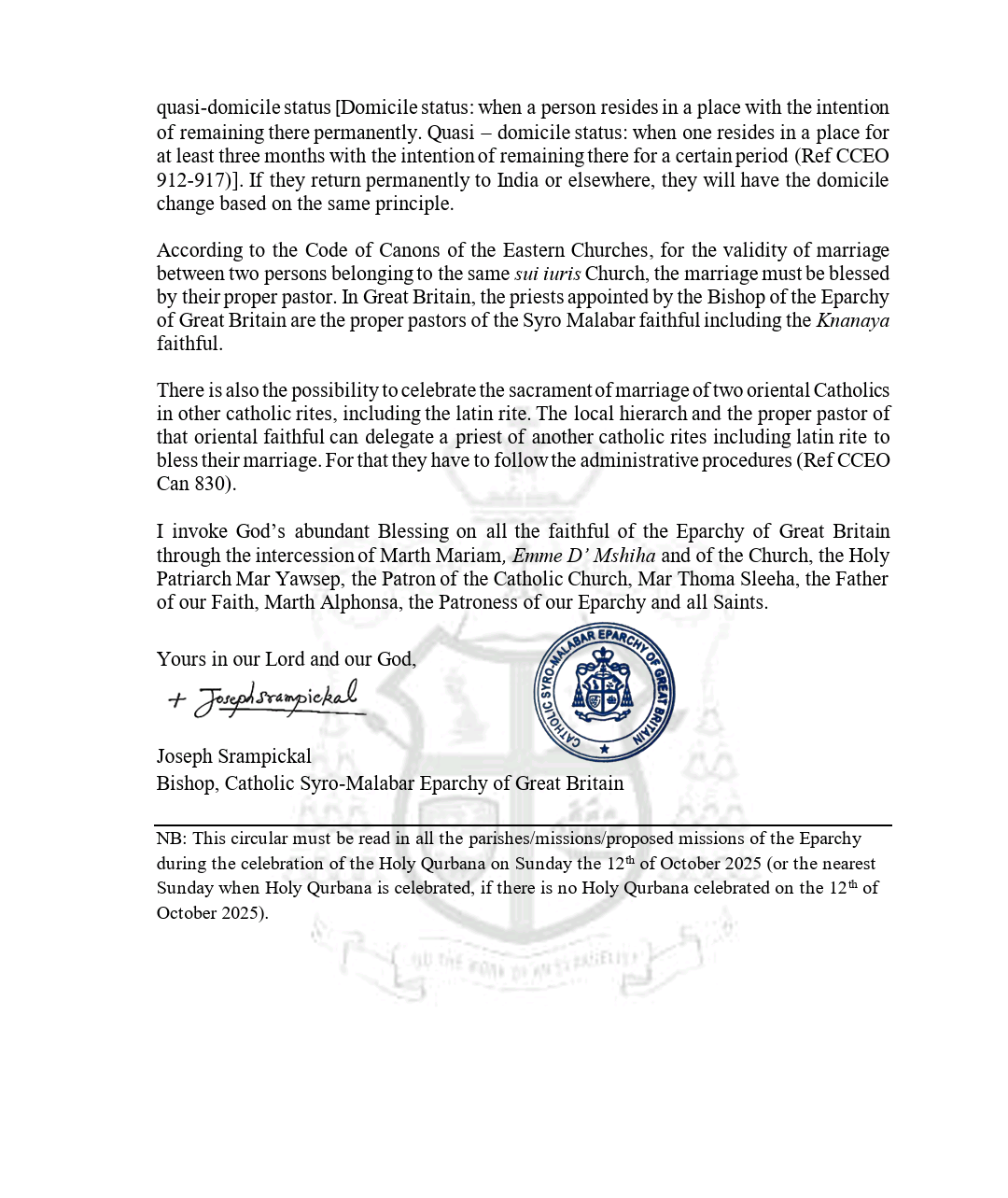 യുകെയിലെ ക്നാനായ കത്തോലിക്കാ വിശ്വാസികളുടെ തനിമയും പാരമ്പര്യവും സംരക്ഷിക്കാൻ സർക്കുലറുമായി ഗ്രേറ്റ് ബ്രിട്ടൻ സീറോമലബാർ രൂപത