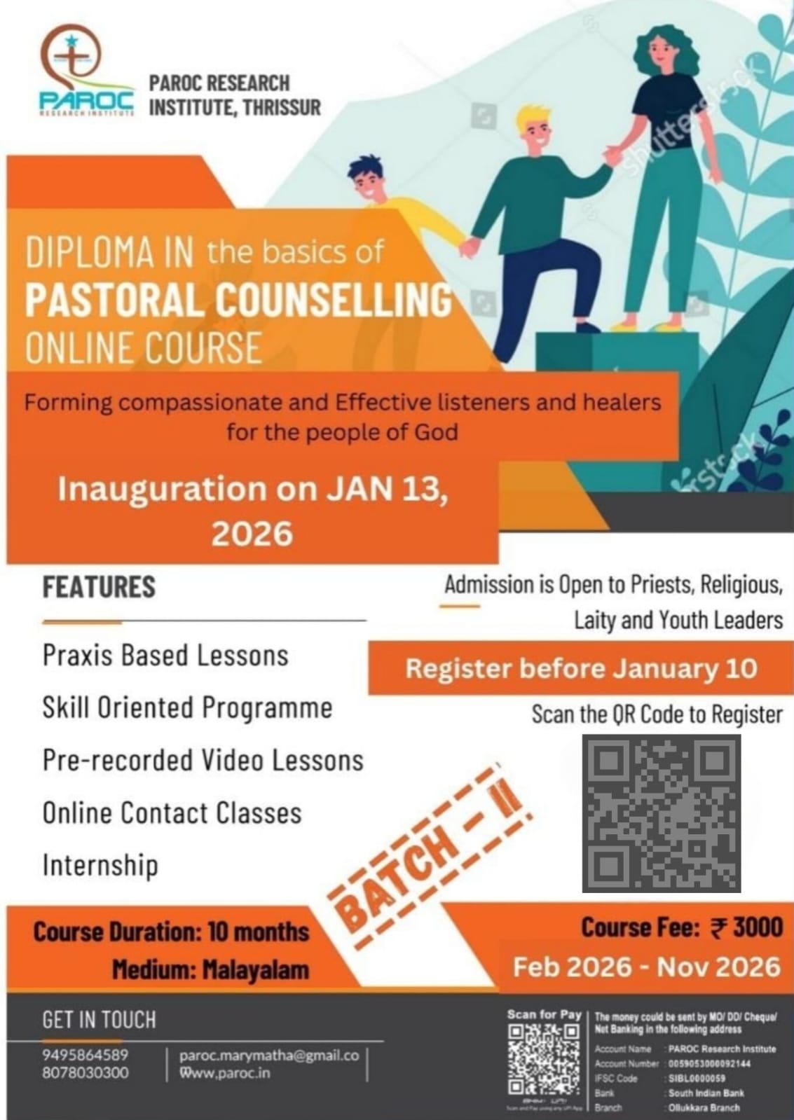തൃശൂർ: സങ്കീർണമായ സമകാലിക അജപാലന സാഹചര്യങ്ങളെ നേരിടാൻ കഴിവുള്ള, ഹൃദയത്തിൽ അലിവുള്ള അജപാലകരെ വാർത്തെടുക്കുക എന്ന ലക്ഷ്യത്തോടെ പറോക് ഗവേഷണകേന്ദ്രം Diploma in Pastoral Counselling' എന്ന കോഴ്സ് ആരംഭിക്കുന്നു. യുവജനങ്ങൾ, കുട്ടികൾ, മാതാപിതാക്കൾ, ദമ്പതിമാർ എന്നിവരുടെ നീറുന്ന വേദനകളുമായി സമീപിക്കുന്നവരെ ആത്മീയമായും അജപാലനപരമായും പിന്തുണയ്ക്കാൻ സഹായിക്കുന്ന വൈദഗ്ധ്യം കോഴ്സിലൂടെ ലഭിക്കും. കൗൺസലിംഗ്, മനശാസ്ത്രം, അജപാലനം എന്നിവയിൽ ഉപരിപഠനങ്ങളും പ്രായോഗികപരിജ്ഞാനവുമുള്ള വിദഗ്ധരാണ് ക്ലാസുകൾ നയിക്കുന്നത്.